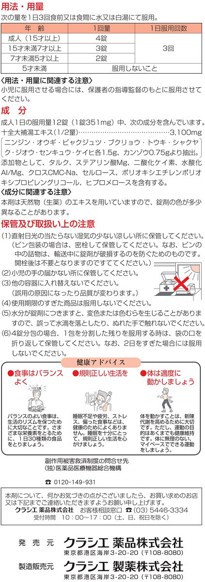 | (12錠中) 十全大補湯エキス(1/2量):3100mg (ニンジン・オウギ・ビャクジュツ・ブクリョウ・トウキ・シャクヤク・ジオウ・センキュウ・ケイヒ各1.5g、カンゾウ0.75gより抽出。) 添加物:タルク、ステアリン酸Mg、二酸化ケイ素、水酸化AL/Mg、クロスCMC-Na、セルロース、ポリオキシエチレンポリオキシプロピレングリコール、ヒプロメロース ※本剤は天然物(生薬)のエキスを用いていますので、錠剤の色が多少異なることがあります。 |