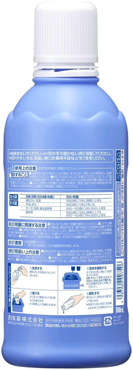哺乳びん、乳首:約80倍にうすめ、1時間以上浸す。