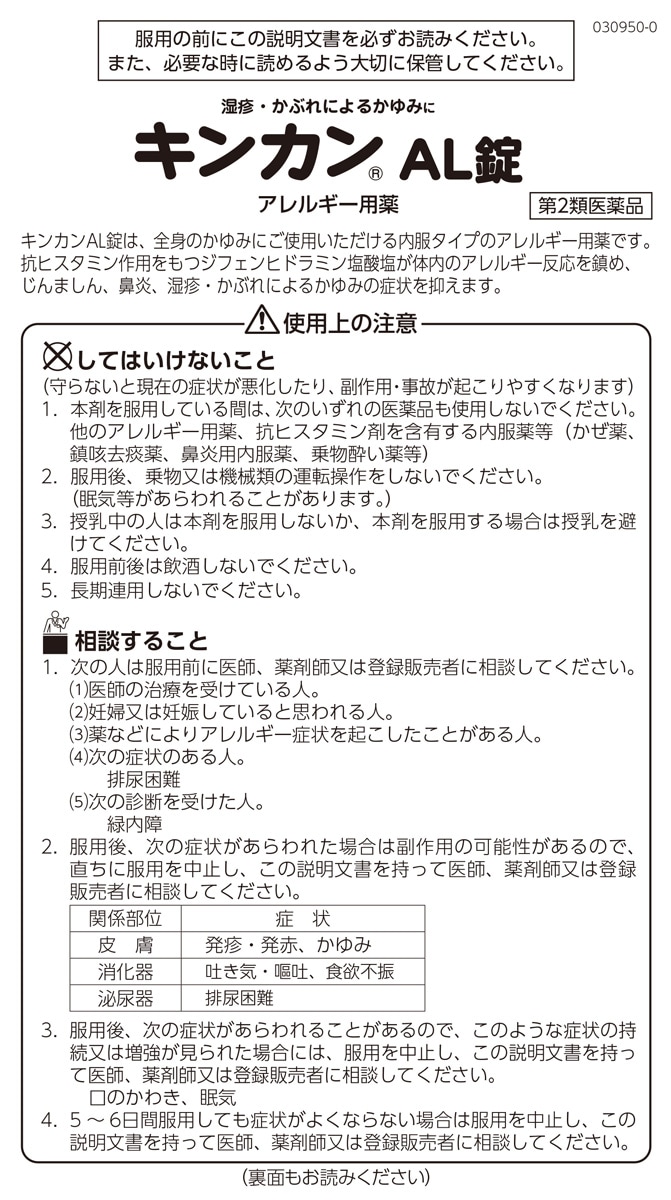 ●キンカンAL錠は、全身のかゆみにご使用いただける内服タイプのアレルギー用薬です。