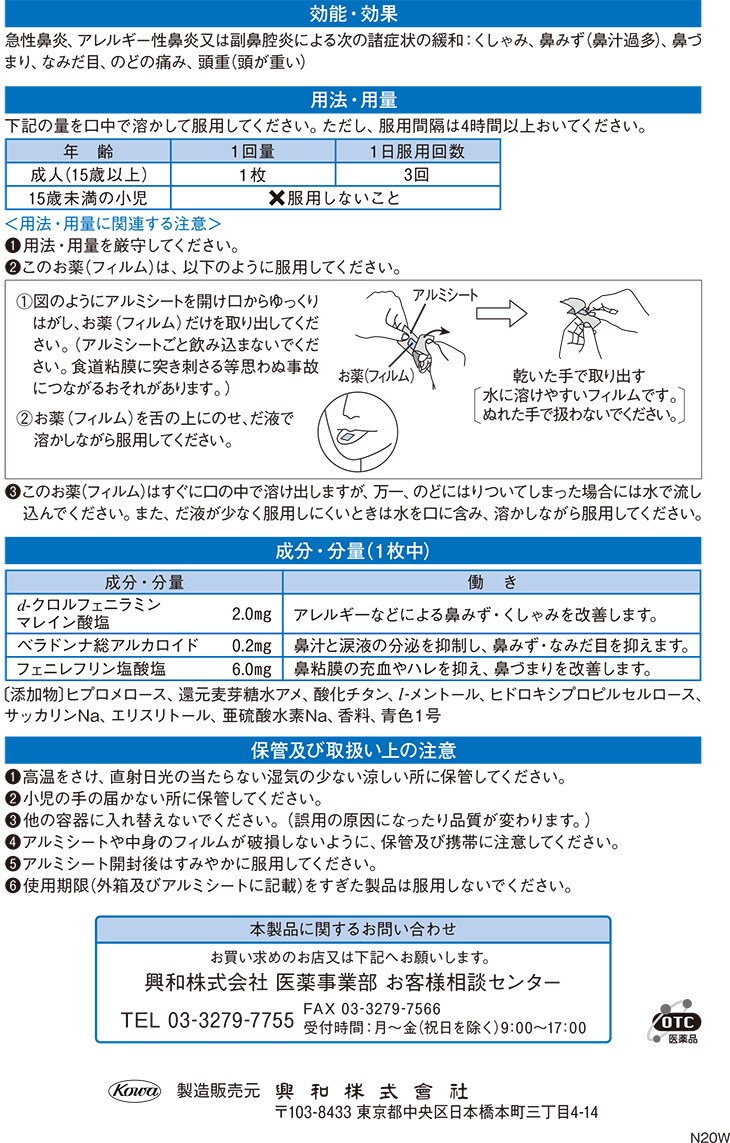 | 急性鼻炎、アレルギー性鼻炎又は副鼻腔炎による次の諸症状の緩和:くしゃみ、鼻みず(鼻汁過多)、鼻づまり、なみだ目、のどの痛み、頭重(頭が重い) |
