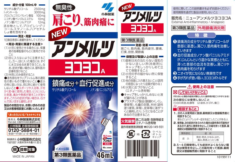 | 100mL中 サリチル酸グリコール:2500mg L-メントール:3000mg クロルフェニラミンマレイン酸塩:100mg ニコチン酸ベンジルエステル:10mg ノナン酸バニリルアミド:12mg 添加物として、プロピレングリコール、エタノール、ハアセチルしょ糖を含有する |