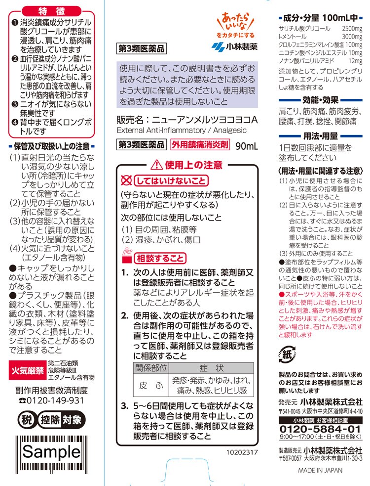 | 100mL中 サリチル酸グリコール;2500mg l-メントール:3000mg クロルフェニラミンマレイン酸塩:100mg ニコチン酸ベンジルエステル:10mg ノナン酸バニリルアミド:12mg 添加物として、プロピレングリコール、エタノール、八アセチルしょ糖を含有する |