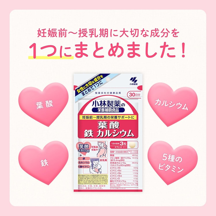 ●小林製薬の「葉酸 鉄 カルシウム」は、女性に大切な栄養素をまとめた、妊娠前・妊娠期・授乳期をサポートするサプリメント。