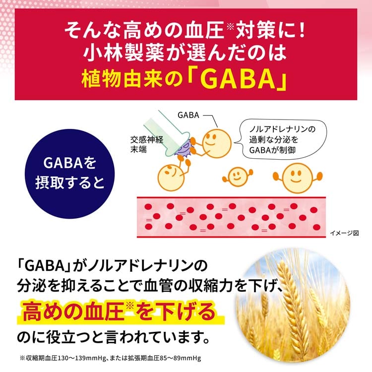 届出表示:本品にはγ-アミノ酪酸(GABA)が含まれます。γ-アミノ酪酸(GABA)には、血圧が高めの方の血圧を下げる機能が報告されています。