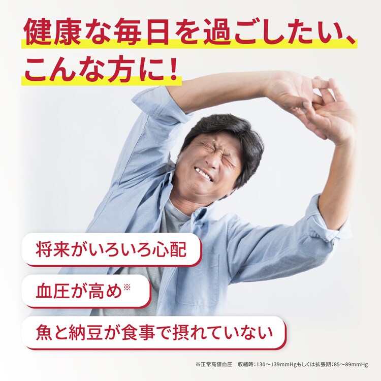 ●本品には納豆菌由来ナットウキナーゼが含まれます。納豆菌由来ナットウキナーゼは、血流(末梢)を改善することで血圧が高めの方の血圧を下げる機能が報告されています。