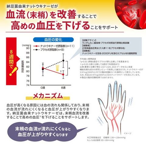 本品には納豆菌由来ナットウキナーゼが含まれます。納豆菌由来ナットウキナーゼは、血流(末梢)を改善することで血圧が高めの方の血圧を下げる機能が報告されています。