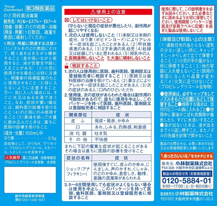 (1)ノズルをのどの患部にむけて、軽く息をはきながら噴射すること(息を吸いながら使用すると、液が気管支や肺に入ることがある)
