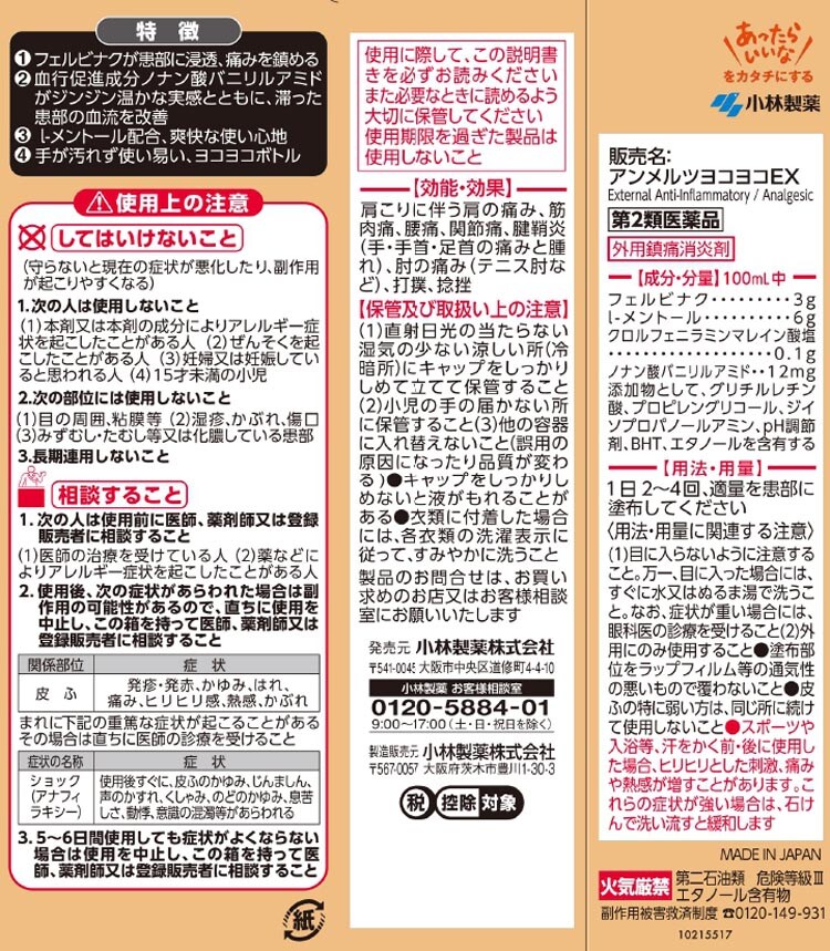 | 100ml中 フェルビナク:3g l-メントール:6g クロルフェニラミンマレイン酸塩:0.1g ノナン酸バニリルアミド:12mg 添加物として、グリチルレチン酸、プロピレングリコール、ジイソプロパノールアミン、pH調節剤、BHT、エタノールを含有する |