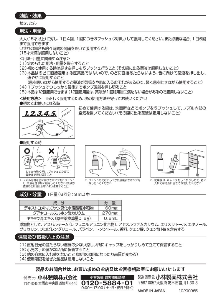 | 1日量(6回分:9mL)中 [成分:分量] デキストロメトルファン臭化水素酸塩水和物:60mg グアヤコールスルホン酸カリウム:270mg キキョウ流エキス(原生薬換算量0.6g):0.6mL 添加物として、アスパルテーム(L-フェニルアラニン化合物)、アセスルファムカリウム、エリスリトール、エタノール、グリセリン、プロピレングリコール、パラベン、l-メントール、香料、クエン酸、クエン酸Naを含有する |