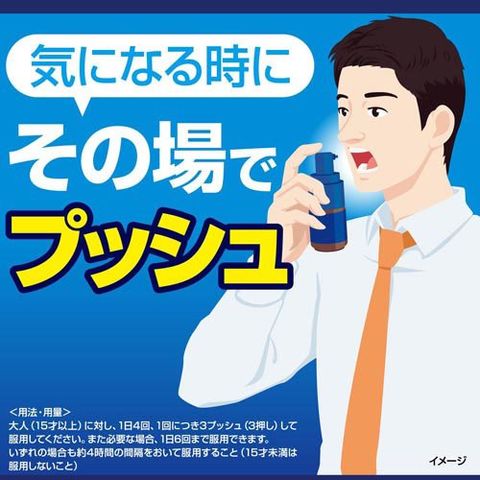 大人(15才以上)に対し、1日4回、1回につき3プッシュ(3押し)して服用してください。また必要な場合、1日6回まで服用できます