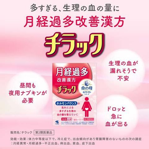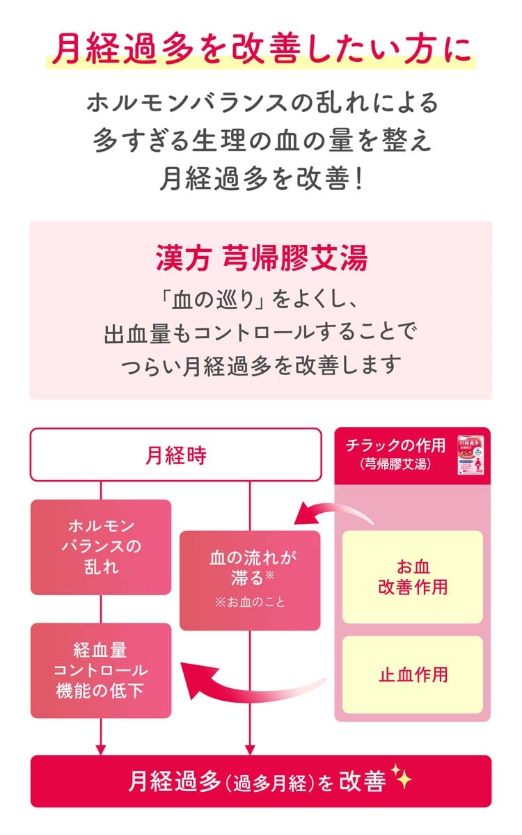●生理の時、昼なのに夜用ナプキンを使わないと漏れないか心配になるくらい、経血量が多くてつらい、月経過多の方のための医薬品です