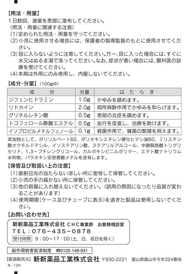 | (100g中) ジフェンヒドラミン:1.0g リドカイン:2.0g グリチルレチン酸:0.5g 酢酸トコフェロール:0.5g イソプロピルメチルフェノール:0.1g 添加物として、ポリソルベート60、ポリオキシエチレン硬化ヒマシ油60、ミリスチン酸オクチルドデシル、イソステアリン酸、ステアリルアルコール、中鎖脂肪酸トリグリセリド、1.3-ブチレングリコール、カルボキシビニルポリマー、エデト酸ナトリウム水和物、パラオキシ安息香酸メチルを含有します。 |
