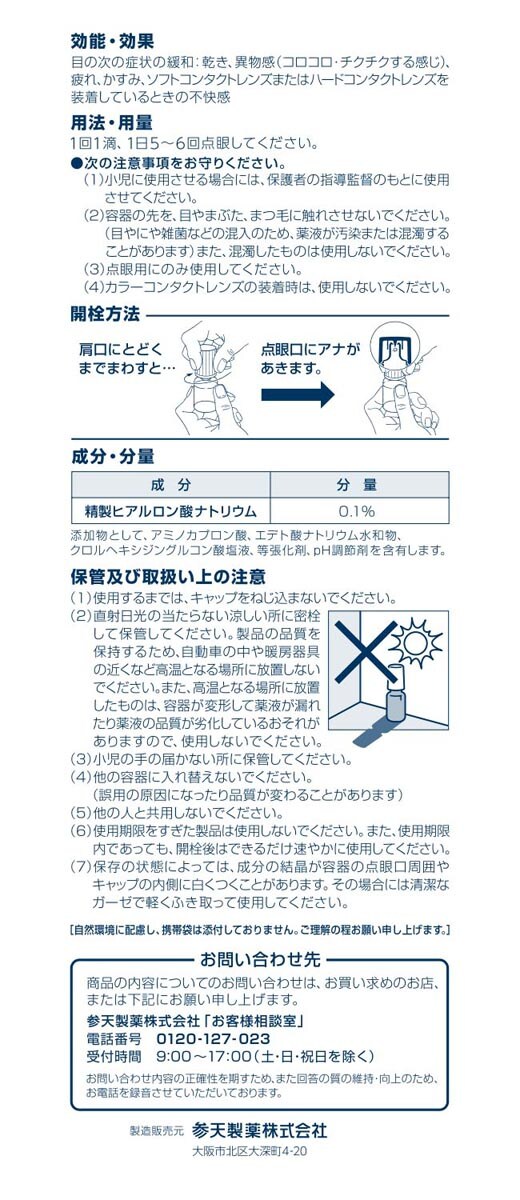| 目の次の症状の緩和:乾き、異物感(コロコロ・チクチクする感じ)、疲れ、かすみ、ソフトコンタクトレンズまたはハードコンタクトレンズを装着しているときの不快感 |