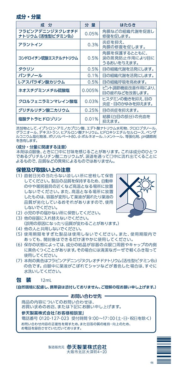 | フラビンアデニンジヌクレオチドナトリウム(活性型ビタミンB2):0.05% アラントイン:0.3% コンドロイチン硫酸エステルナトリウム:0.5% タウリン:0.5% パンテノール:0.1% L-アスパラギン酸カリウム:0.5% ネオスチグミンメチル硫酸塩:0.005% クロルフェニラミンマレイン酸塩:0.03% グリチルリチン酸二カリウム:0.25% 塩酸テトラヒドロゾリン:0.01% 添加物として、イプシロン-アミノカプロン酸、エデト酸ナトリウム水和物、クロロブタノール、ゲラニオール、デキストラン、ヒアルロン酸ナトリウム、ヒドロキシエチルセルロース、ベンザルコニウム塩化物液、ポリソルベート80、d-ボルネオール、l-メントール、等張化剤、pH調節剤を含有します。 ★成分・分量に関連する注意 本剤は点眼後、ときに口中に甘味を感じることがあります。 これは成分のひとつであるグリチルリチン酸ニカリウムが、涙道を通って口中に流れ出てくることによるもので、品質などの異常によるものではありません。 |