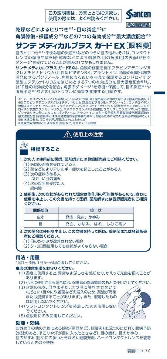 ●サンテメディカルプラスガードEXは、角膜の修復を促すフラビンアデニンジヌクレオチドナトリウム(活性型ビタミンB2)、アラントイン、角膜の組織代謝を活発にするパンテノール、角膜にうるおいを与えて保護するコンドロイチン硫酸エステルナトリウムをはじめとする7つの有効成分を最大濃度配合※1し、計10種の有効成分を配合。
