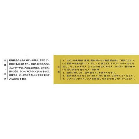 紫外線その他の光線による眼炎(雪目など)、眼瞼炎(まぶたのただれ)、眼病予防(水泳のあと、ほこりや汗が目に入ったときなど)、目の疲れ、目のかゆみ、目のかすみ(目やにの多いときなど)、結膜充血、ハードコンタクトレンズを装着しているときの不快感