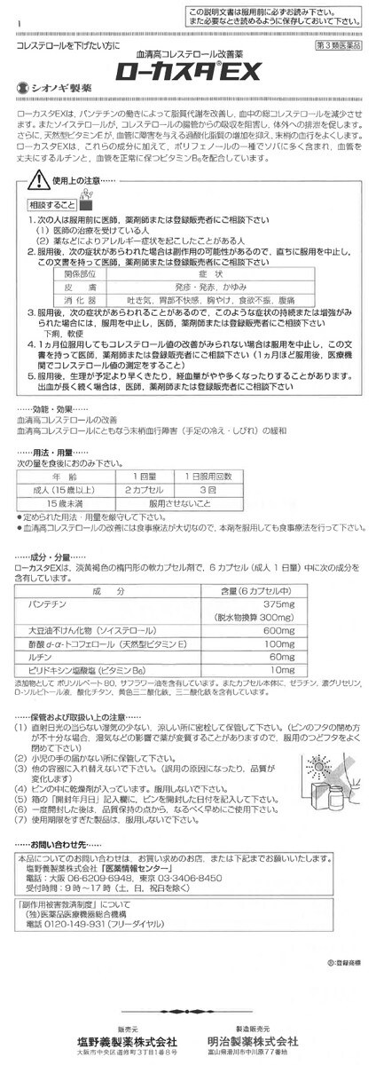 | ・ローカスタEXは、淡黄褐色の楕円形の軟カプセル剤で、6カプセル(成人1日量)中に次の成分を含有しています。 (含量(6カプセル中)) パンテチン:375mg(脱水物換算300mg) 大豆油不けん化物(ソイステロール):600mg 酢酸d-α-トコフェロール(天然型ビタミンE):100mg ルチン:60mg ピリドキシン塩酸塩(ビタミンB6):10mg 添加物としてポリソルベート80、サフラワー油を含有しています。またカプセル本体に、ゼラチン、濃グリセリン、D-ソルビトール液、酸化チ夕ン、黄色三二酸化鉄、三二酸化鉄を含有しています。 |