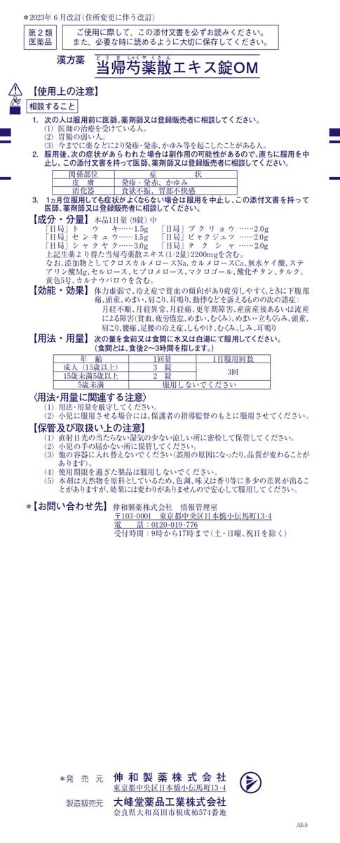 | 本品1日量(9錠)中 「日局」トウキ:1.5g 「日局」センキュウ:1.5g 「日局」シャクヤク:3.0g 「日局」ブクリョウ :2.0g 「日局」ビャクジュツ :2.0g 「日局」タクシャ :2.0g 上記生薬より得た当帰芍薬散エキス(1/2量)2200mgを含む。 なお、添加物としてクロスカルメロースNa、カルメロースCa、無水ケイ酸、ステアリン酸Mg、セルロース、ヒプロメロース、マクロゴール、酸化チタン、タルク、黄色5号、カルナウバロウを含む。 |
