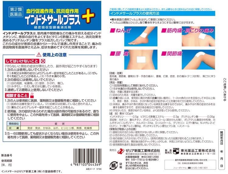 ●インドメサールプラスは、非ステロイド性消炎鎮痛成分であるインドメタシンをOTC貼付剤として最大量配合したパップ剤です。