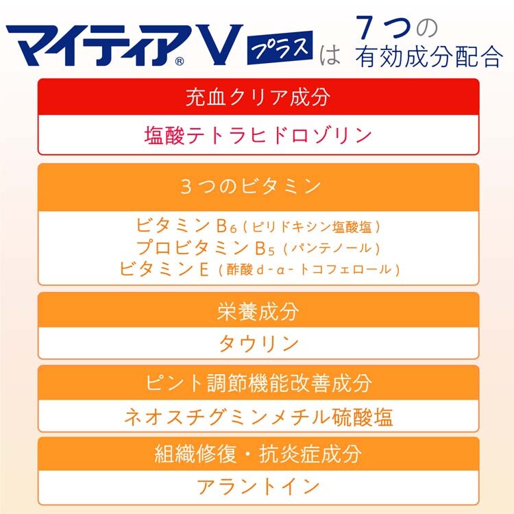 | 1ml中 塩酸テトラヒドロゾリン:0.5mg ネオスチグミンメチル硫酸塩:0.05mg ピリドキシン塩酸塩(ビタミンB6):0.5mg パンテノール(プロビタミンB5):0.5mg 酢酸d-α-トコフェロール(ビタミンE):0.5mg タウリン:10mg アラントイン:1mg 添加物:塩化ナトリウム、L-グルタミン酸ナトリウム水和物、ホウ酸、ポリオキシエチレン硬化ヒマシ油60、クロロブタノール、ベンザルコニウム塩化物、L-メントール、pH調節剤 |