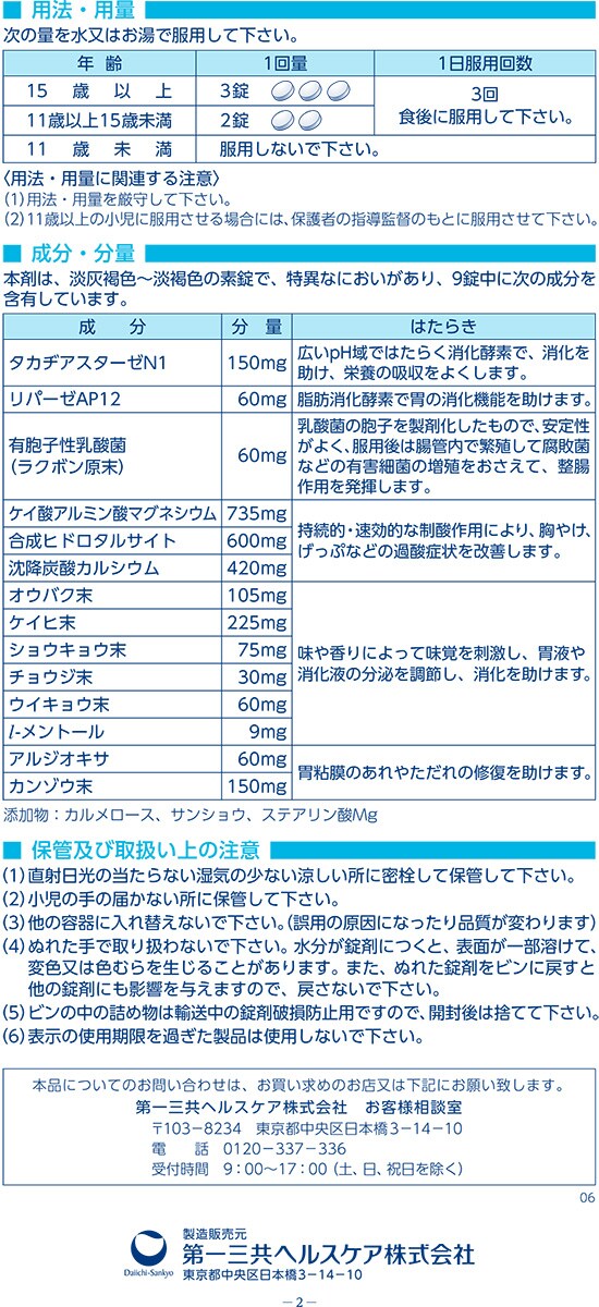 | 本剤は、淡灰褐色~淡褐色の素錠で、特異なにおいがあり、9錠中に次の成分を含有しています。 タカヂアスターゼN1:150mg リパーゼAP12:60mg 有胞子性乳酸菌(ラクボン原末):60mg ケイ酸アルミン酸マグネシウム:735mg 合成ヒドロタルサイト:600mg 沈降炭酸カルシウム:420mg オウバク末:105mg ケイヒ末:225mg ショウキョウ末:75mg チョウジ末:30mg ウイキョウ末:60mg L-メントール:9mg アルジオキサ:60mg カンゾウ末:150mg 添加物:カルメロース、サンショウ、ステアリン酸Mg |