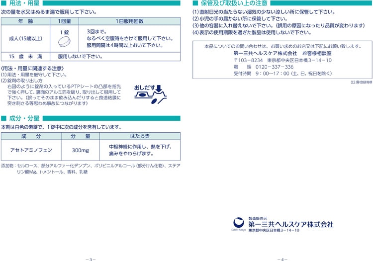 | 本剤は白色の素錠で、1錠中に次の成分を含有しています。 [成分:分量:はたらき] アセトアミノフェン:300mg:中枢神経に作用し、熱を下げ、痛みをやわらげます。 添加物:セルロース、部分アルファー化デンプン、ポリビニルアルコール(部分けん化物)、ステアリン酸Mg、l-メントール、香料、乳糖 |