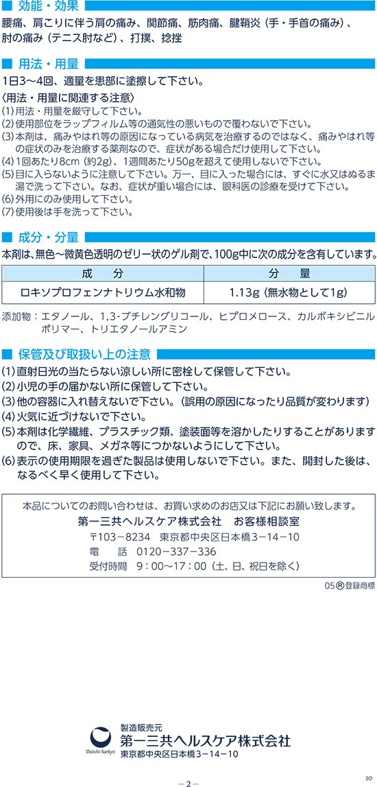 | 本剤は、無色~微黄色透明のゼリー状のゲル剤で、100g中に次の成分を含有しています。 成分:分量 ロキソプロフェンナトリウム水和物:1.13g(無水物として1g) 添加物:エタノール、1、3-ブチレングリコール、ヒプロメロース、カルボキシビニルポリマー、トリエタノールアミン |
