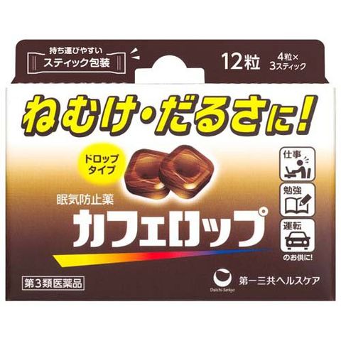 ●無水カフェイン500mg(12粒あたり)が大脳皮質に作用して、ねむけ・だるさを除去するドロップタイプの眠気防止剤です。
