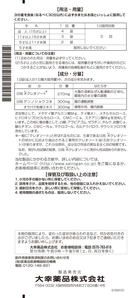 | 12錠(成人の1日最大服用量)中、次の成分を含みます。 [成分:分量:はたらき] 日局木(もく)クレオソート※:270mg:大腸の過剰なぜん動運動の正常化、腸管内の水分量の調整 日局ゲンノショウコ末:300mg:腸の運動調整 オウバク乾燥エキス:300mg:健胃作用、腸内静菌 添加物として、メタケイ酸アルミン酸Mg、ケイ酸Al、メチルセルロース、ヒドロキシプロピルセルロース、CMCーCa、ステアリン酸Mgを含有しています。この他に糖衣層として、白糖、アラビアゴム、ゼラチン、タルク、炭酸Ca、酸化チタン、CMCーNa、マクロゴール、カルナウバロウ、サラシミツロウを含有しています。 ※一般に「クレオソート」と呼ばれるものには、生薬である日局木もくクレオソートのほかに石炭より抽出される工業用のクレオソート油(石炭クレオソート)がありますが、これらは原料、成分及び用途の異なる全く別の物質です。なお、発がん性試験の結果、日局木もくクレオソートに発がん性は認められませんでした。 |