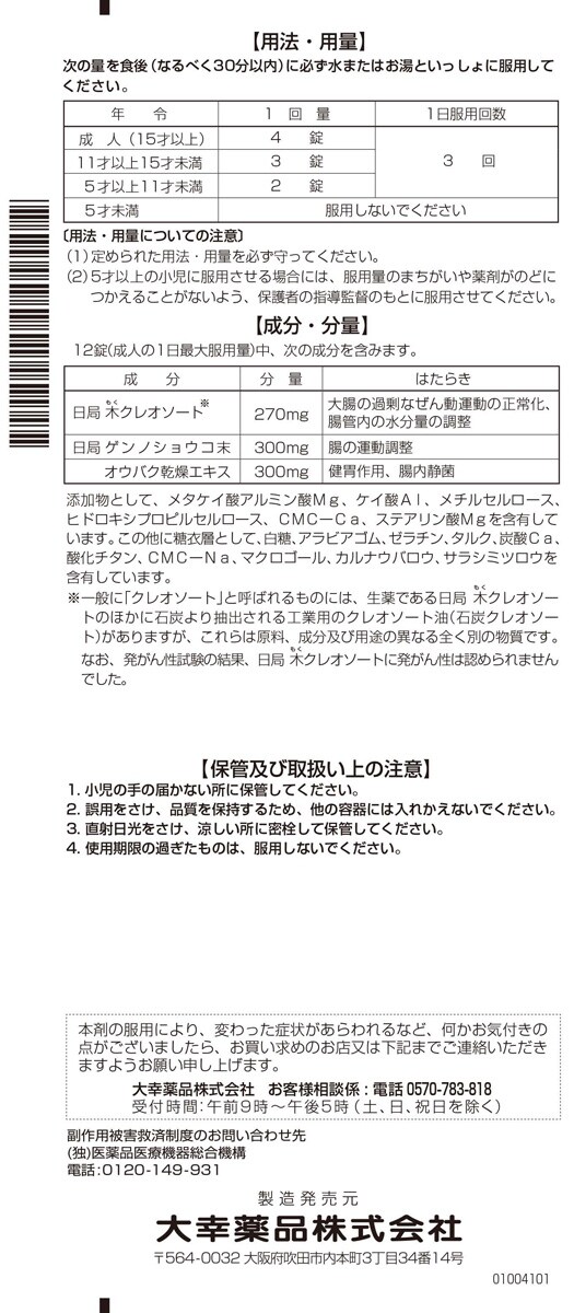 | 12錠(成人の1日最大服用量)中、次の成分を含みます。 [成分:分量:はたらき] 日局木クレオソート※:270mg:大腸の過剰なぜん動運動の正常化、腸管内の水分量の調整 日局ゲンノショウコ末:300mg:腸の運動調整 オウバク乾燥エキス:300mg:健胃作用、腸内静菌 添加物として、メタケイ酸アルミン酸Mg、ケイ酸Al、メチルセルロース、ヒドロキシプロピルセルロース、CMC-Ca、ステアリン酸Mg を含有しています。この他に糖衣層として、白糖、アラビアゴム、ゼラチン、タルク、炭酸Ca、酸化チタン、CMC-Na、マクロゴール、カルナウバロウ、サラシミツロウを含有しています。 ※一般に「クレオソート」と呼ばれるものには、生薬である日局 木クレオソートのほかに石炭より抽出される工業用のクレオソート油(石炭クレオソート)がありますが、これらは原料、成分及び用途の異なる全く別の物質です。なお、発がん性試験の結果、日局 木クレオソートに発がん性は認められませんでした。 |