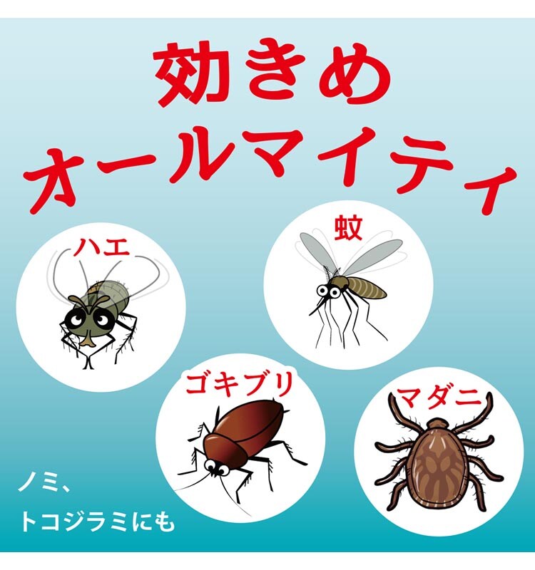 ハエ成虫、蚊成虫、ゴキブリ、ノミ、トコジラミ(ナンキンムシ)、イエダニ、マダニの駆除。