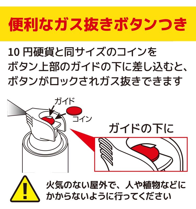 10円硬貨と同サイズのコインをボタン上部のガイドの下に差込むとボタンがロックされ、廃棄時にガス抜きができます。