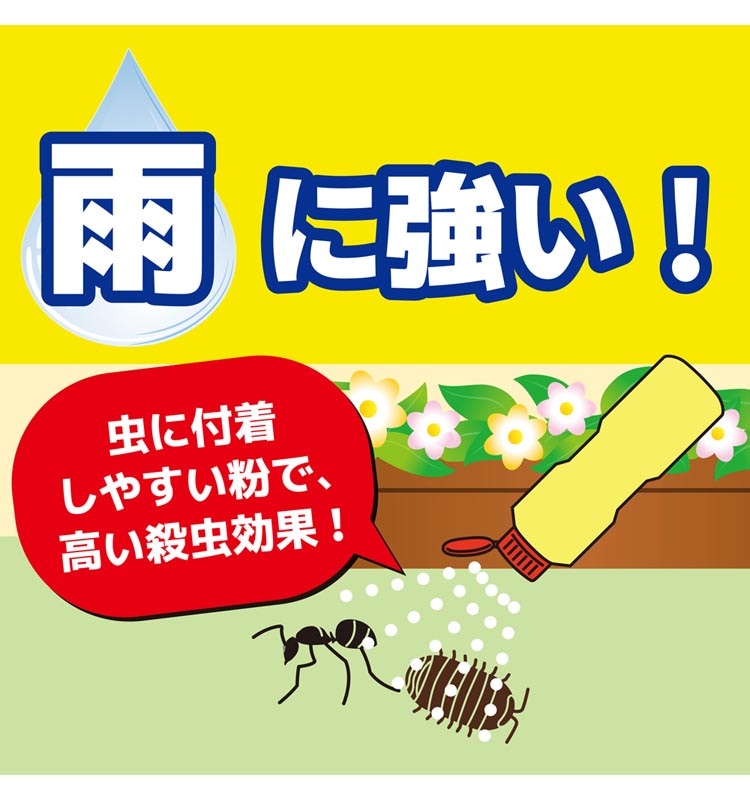 ●優れた付着性能!虫にまとわり付きやすい粉を使用しているので、優れた殺虫効果を発揮します。また、雨がふっても流されにくく、効果が持続します。