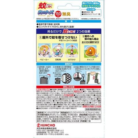 ・季節を問わず蚊の出る時期に約150日間ずっと効く!吊り下げに便利なカラビナフック付き。