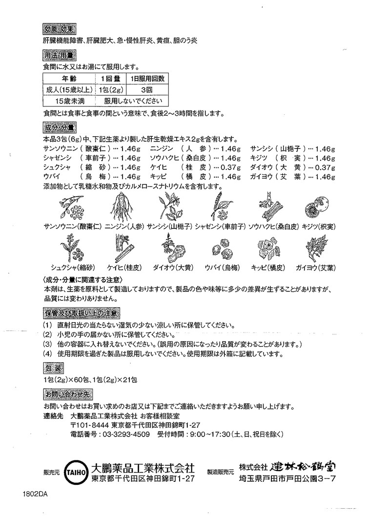 本品3包(6g)中、下記生薬より製した肝生乾燥エキス2gを含有します。