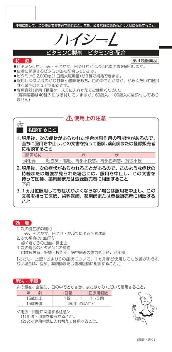 | (1)次の諸症状の緩和:しみ、そばかす、日やけ・かぶれによる色素沈着 (2)次の場合の出血予防:歯ぐきからの出血、鼻出血 (3)次の場合のビタミンCの補給:肉体疲労時、妊娠、授乳期、病中病後の体力低下時、老年期 ただし、上記(1)および(2)の症状について、1ヵ月ほど使用しても改善がみられない場合は、医師、薬剤師または歯科医師にご相談ください。 |