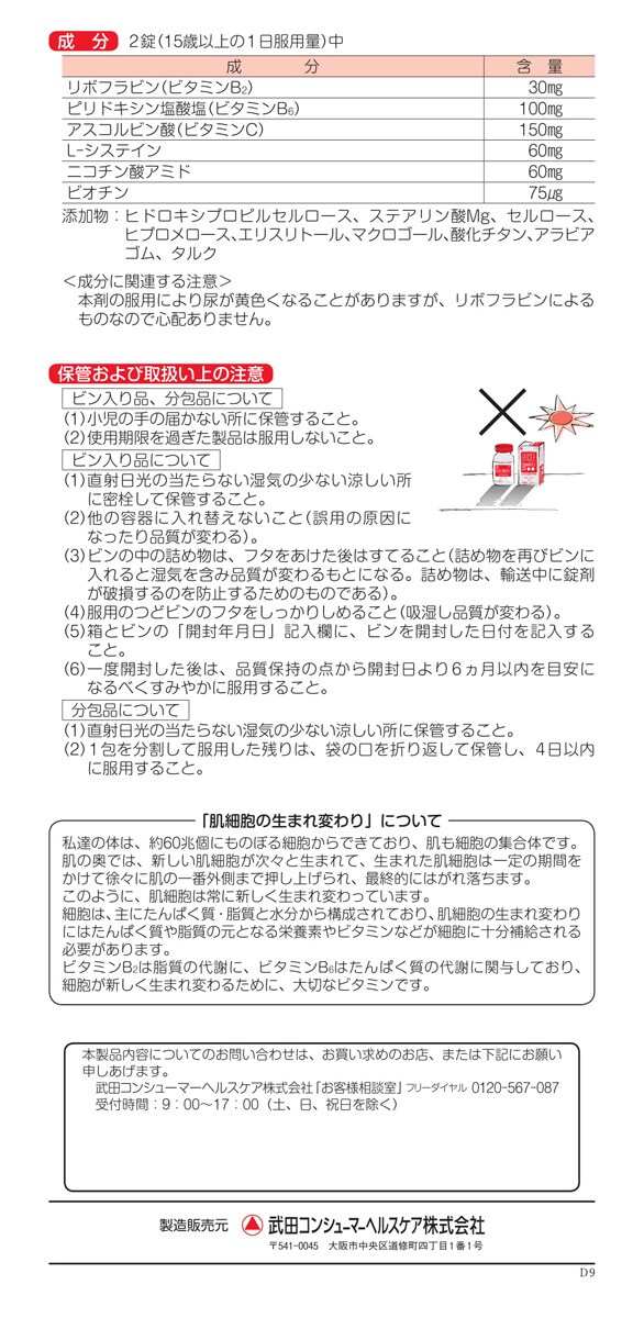 | リボフラビン(ビタミンB2):30mg ピリドキシン塩酸塩(ビタミンB6):100mg アスコルビン酸(ビタミンC):150mg L‐システイン:60mg ニコチン酸アミド:60mg ビオチン:75μg 添加物:ヒドロキシプロピルセルロース、ステアリン酸Mg、セルロース、ヒプロメロース、エリスリトール、マクロゴール、酸化チタン、アラビアゴム、タルク ★成分に関する注意 ・本剤の服用により尿が黄色くなることがありますが、リボフラビンによるものなので心配ありません。 |