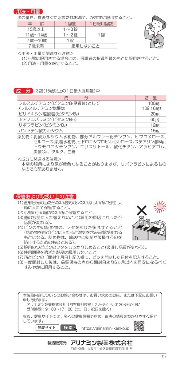 本品内容についてのお問い合わせは、お買い求めのお店、または下記にお願い申しあげます。 アリナミン製薬株式会社「お客様相談室」 0120-567-087 受付時間:9:00-17:00(土、日、祝日を除く) 製造販売元:アリナミン製薬株式会社 541-0045 大阪市中央区道修町四丁目1番1号