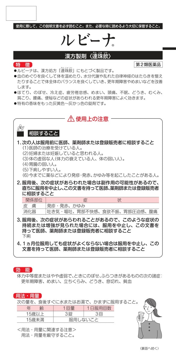 | 体力中等度またはやや虚弱で、ときにのぼせ、ふらつきがあるものの次の諸症:更年期障害、めまい、立ちくらみ、どうき、息切れ、貧血 |
