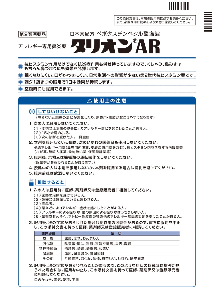 | 成分(1日量:2錠中) ベポタスチンベシル酸塩:20mg 添加物:ステアリン酸Mg、セルロース、タルク、ヒプロメロース、マクロゴール、D-マンニトール |