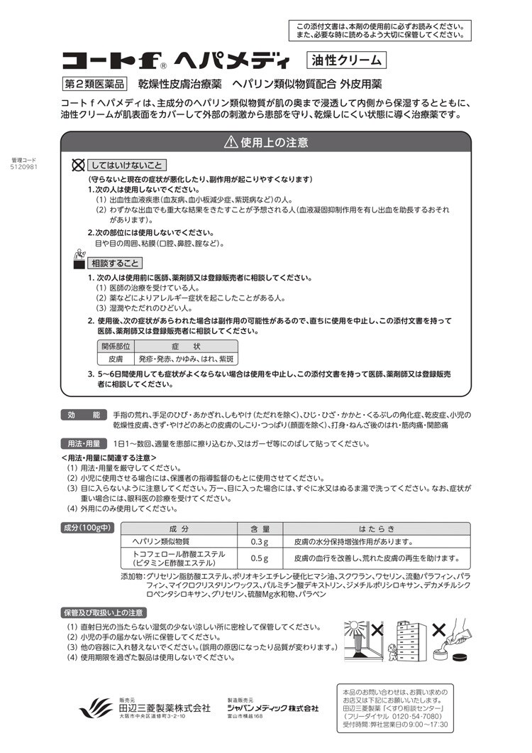 ●コートfへパメディは、主成分のヘパリン類似物質が肌の奥まで浸透して内側から保湿するとともに、油性クリー厶が肌表面をカバーして外部の刺激から患部を守り、乾燥しにくい状態に導く治療薬です。