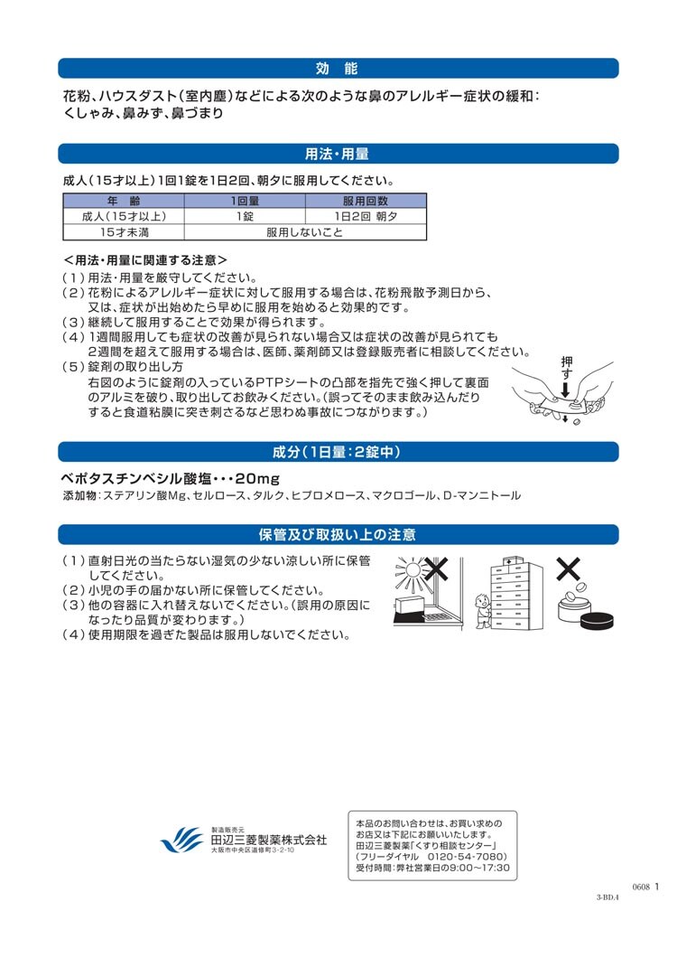 | (1日量:2錠中) ベポタスチンベシル酸塩・・・20mg 添加物:ステアリン酸Mg、セルロース、タルク、ヒプロメロース、マクロゴール、D-マンニトール |