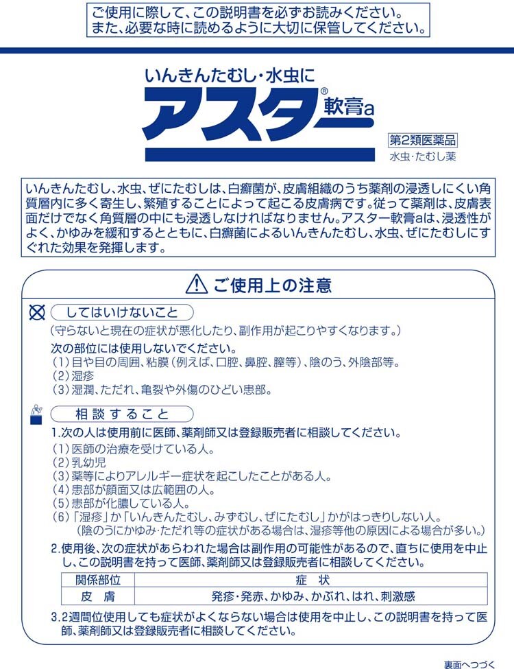 ●アスター軟膏aは、浸透性がよく、かゆみを緩和するとともに、白癬菌によるいんきんたむし、水虫、ぜにたむしにすぐれた効果を発揮します。
