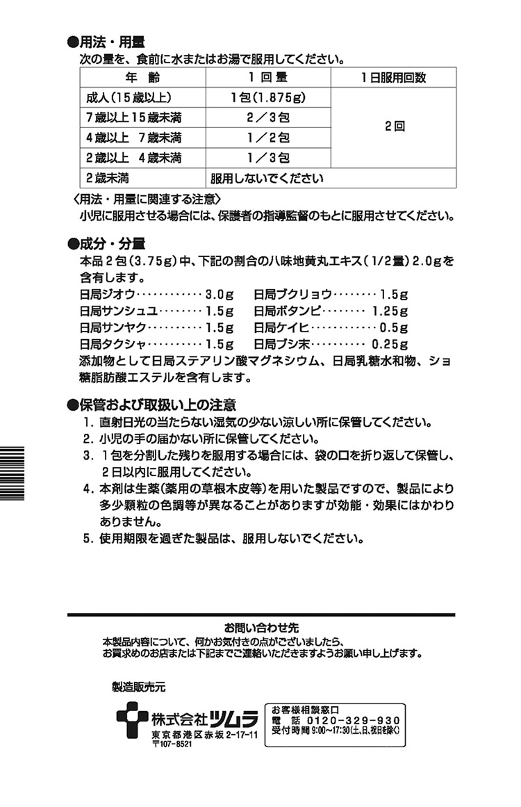 | 本品2包(3.75g)中、下記の割合の八味地黄丸エキス(1/2量)2.0gを含有します。 ・日局ジオウ・・・3.0g ・日局サンシュユ・・・1.5g ・日局サンヤク・・・1.5g ・日局タクシャ・・・1.5g ・日局ブクリョウ・・・1.5g ・日局ボタンピ・・・1.25g ・日局ケイヒ・・・0.5g ・日局ブシ末・・・0.25g 添加物として日局ステアリン酸マグネシウム、日局乳糖水和物、ショ糖脂肪酸エステルを含有します。 |