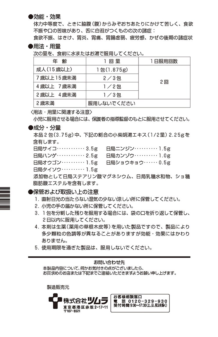 | 本品2包(3.75g)中、下記の割合の小柴胡湯エキス(1/2量)2.25gを含有します。 ・日局サイコ・・・3.5g ・日局ハンゲ・・・2.5g ・日局オウゴン・・・1.5g ・日局タイソウ・・・1.5g ・日局ニンジン・・・1.5g ・日局カンゾウ・・・1.0g ・日局ショウキョウ・・・0.5g 添加物として日局ステアリン酸マグネシウム、日局乳糖水和物、ショ糖脂肪酸エステルを含有します。 |
