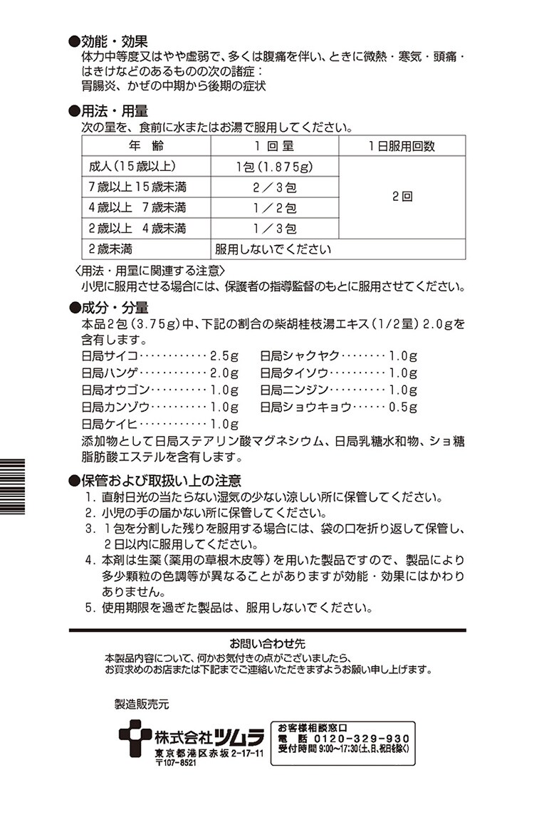 | 本品2包(3.75g)中、下記の割合の柴胡桂枝湯エキス(1/2量)2.0gを含有します。 ・日局サイコ・・・2.5g ・日局ハンゲ・・・2.0g ・日局オウゴン・・・1.0g ・日局カンゾウ・・・1.0g ・日局ケイヒ・・・1.0g ・日局シャクヤク・・・1.0g ・日局タイソウ・・・1.0g ・日局ニンジン・・・1.0g ・日局ショウキョウ・・・0.5g 添加物として日局ステアリン酸マグネシウム、日局乳糖水和物、ショ糖脂肪酸エステルを含有します。 |