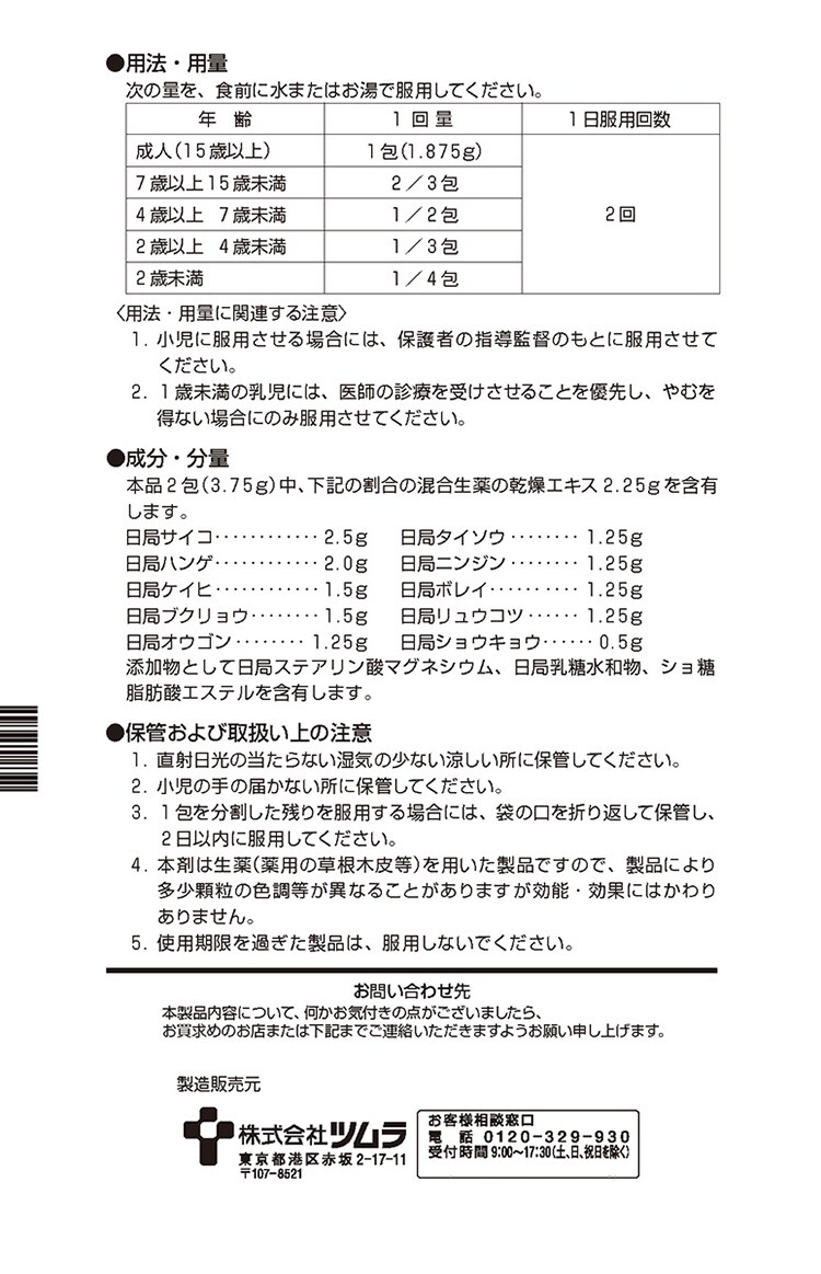 | 本品2包(3.75g)中、下記の割合の混合生薬の乾燥エキス2.25gを含有します。 ・日局サイコ・・・2.5g ・日局ハンゲ・・・2.0g ・日局ケイヒ・・・1.5g ・日局ブクリョウ・・・1.5g ・日局オウゴン・・・1.25g ・日局タイソウ・・・1.25g ・日局ニンジン・・・1.25g ・日局ボレイ・・・1.25g ・日局リュウコツ・・・1.25g ・日局ショウキョウ・・・0.5g 添加物として日局ステアリン酸マグネシウム、日局乳糖水和物、ショ糖脂肪酸エステルを含有します。 |