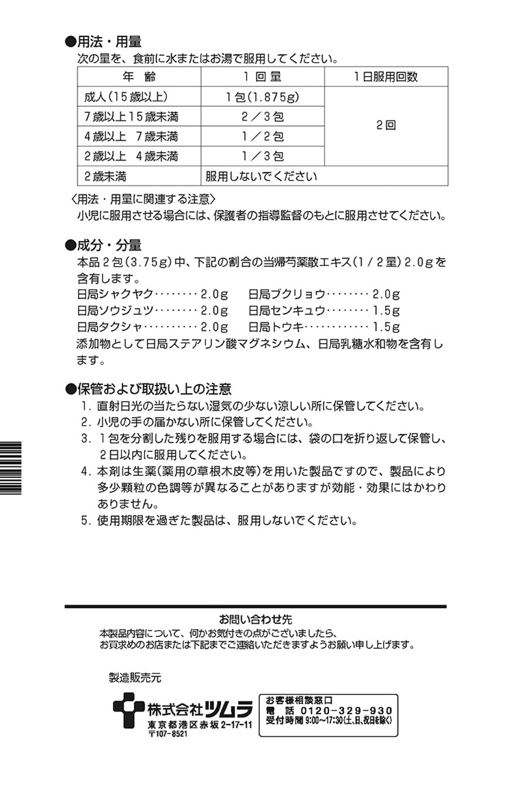 | 本品2包(3.75g)中、下記の割合の当帰芍薬散エキス(1/2量)2.0gを含有します。 ・日局シャクヤク・・・2.0g ・日局ソウジュツ・・・2.0g ・日局タクシャ・・・2.0g ・日局ブクリョウ・・・2.0g ・日局センキュウ・・・1.5g ・日局トウキ・・・1.5g 添加物として日局ステアリン酸マグネシウム、日局乳糖水和物を含有します。 |