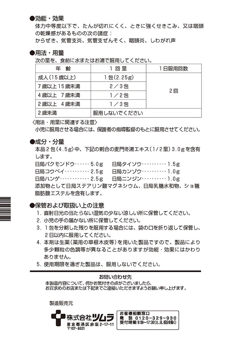 | 本品2包(4.5g)中、下記の割合の麦門冬湯エキス(1/2量)3.0gを含有します。 ・日局バクモンドウ・・・5.0g ・日局コウベイ・・・2.5g ・日局ハンゲ・・・2.5g ・日局タイソウ・・・1.5g ・日局カンゾウ・・・1.0g ・日局ニンジン・・・1.0g 添加物として日局ステアリン酸マグネシウム、日局乳糖水和物、ショ糖脂肪酸エステルを含有します。 |