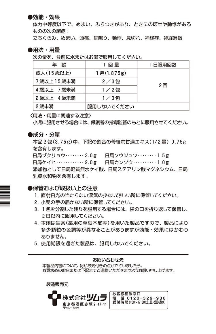 | 本品2包(3.75g)中、下記の割合の苓桂朮甘湯エキス(1/2量)0.75gを含有します。 ・日局ブクリョウ・・・3.0g ・日局ケイヒ・・・2.0g ・日局ソウジュツ・・・1.5g ・日局カンゾウ・・・1.0g 添加物として日局軽質無水ケイ酸、日局ステアリン酸マグネシウム、日局乳糖水和物を含有します。 |